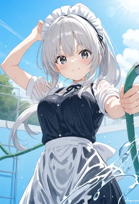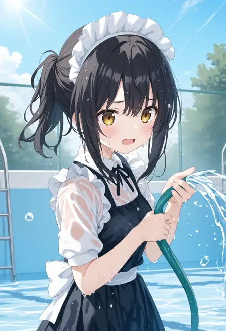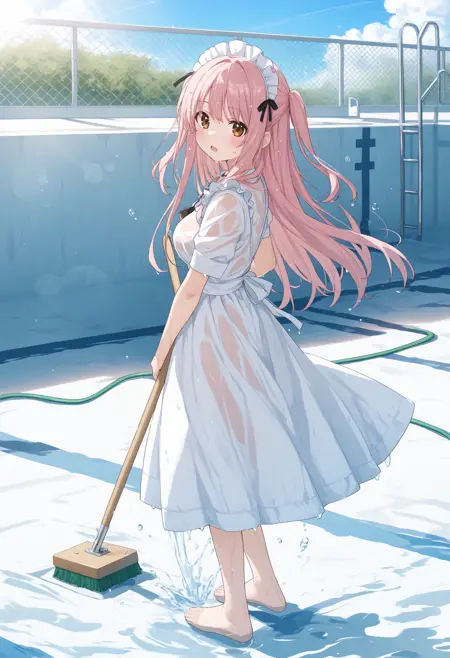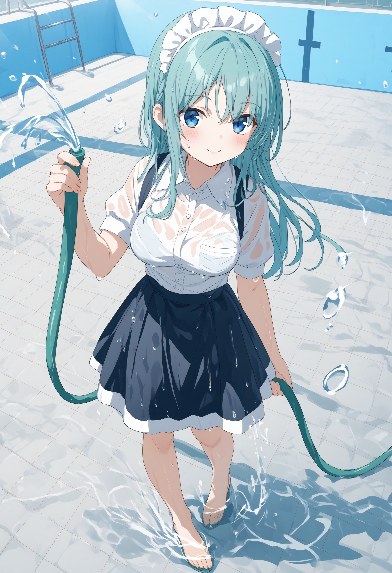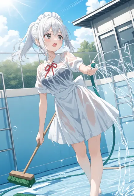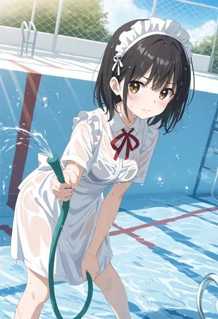 The trigger words are pool, water, day, outdoors, wet, sky,sunlight, wet clothes, water drop, splashing, lens flare, wet hair, sweatdrop, or whatever you need. The rest is holding hose, hose and broom, barefoot, holding broom, cleaning, or both holding a brush or hose.