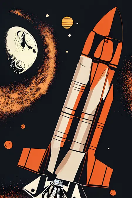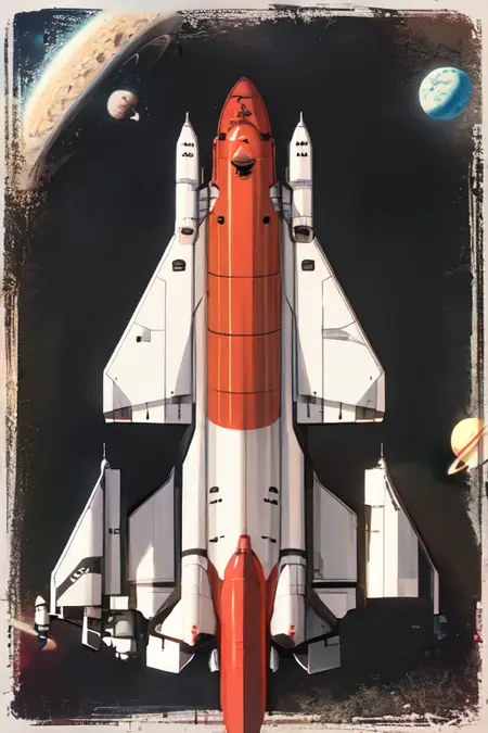 주로 빈티지 과학소설 스타일을 강조하며, 작품에 시대감을 더해보세요. 색상은 단순하지만 단순하지 않게 구성하세요.
