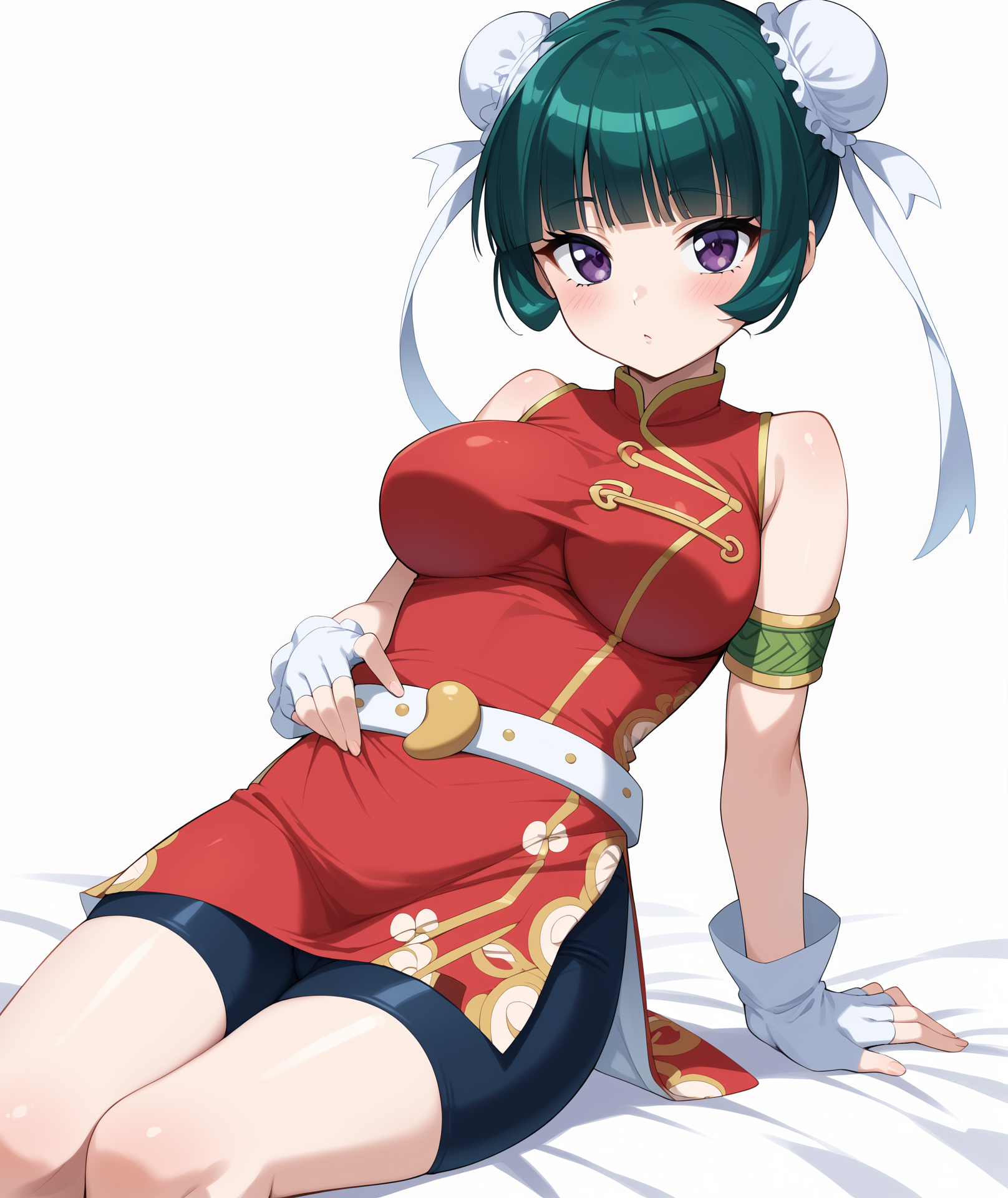 緑の髪、紫の目、短い髪、髪の結び目、ダブルバング、バングカバー、ストレートの前髪、前髪、大きな胸、中くらいの胸、胸