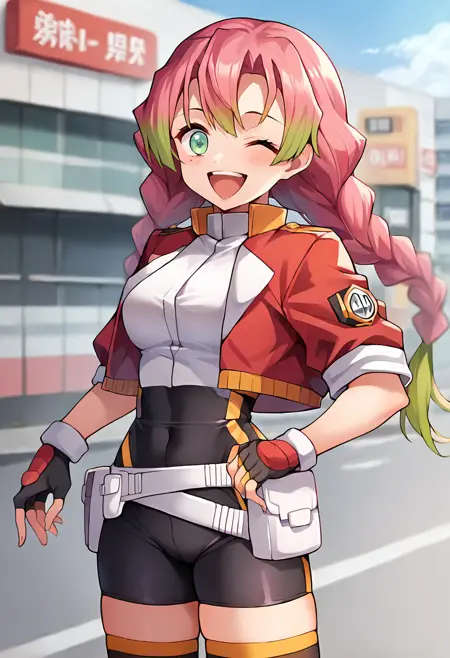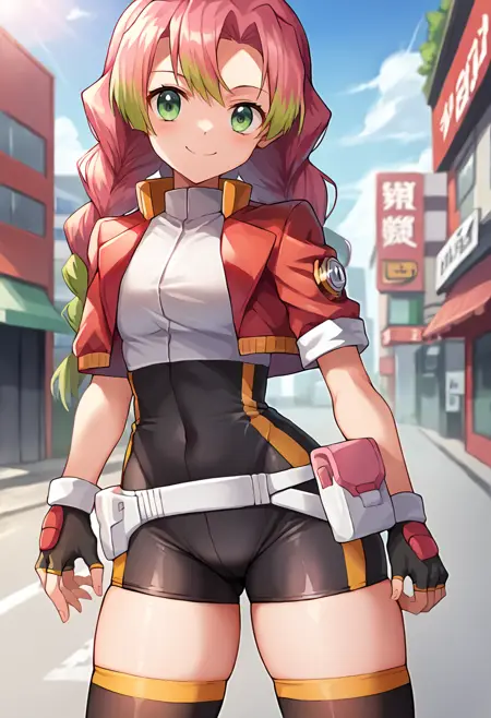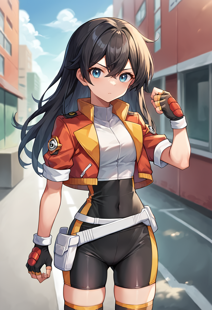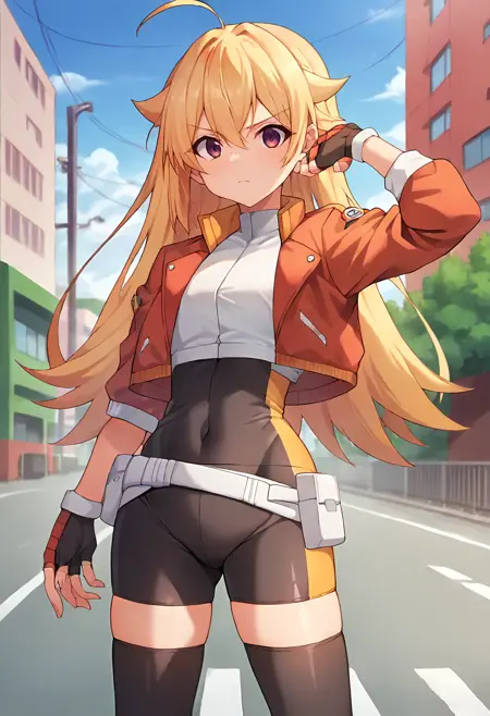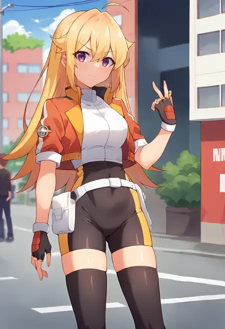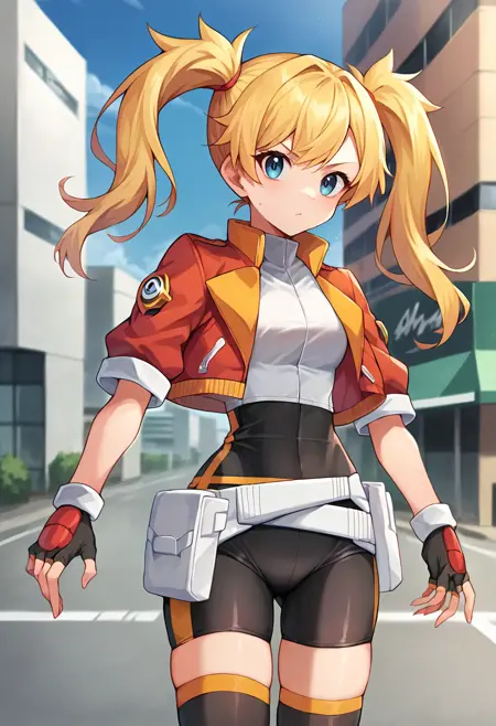 score_9, score_8_up, score_7_up, source_anime, masterpiece, 1girl, ct_s0lana, cropped jacket, white shirt, bike shorts, white belt pouch, black thighhighs, fingerless gloves, skin tight, looking at viewer, outdoors, city, depth of field, day, shiny skin, closed mouth, anime screencap,