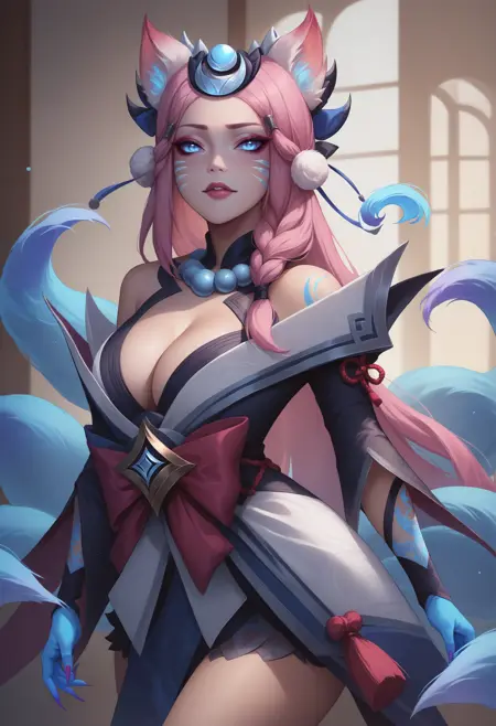 ahriSnwMn, animal ears, facial mark, blue fox tail, multiple tails, long hair, braid, pink hair, blue eyes, large breasts, blue hands, makeup, crescent, hair ornament, short dress, bare shoulders, cleavage, long sleeves, bow, tattoo