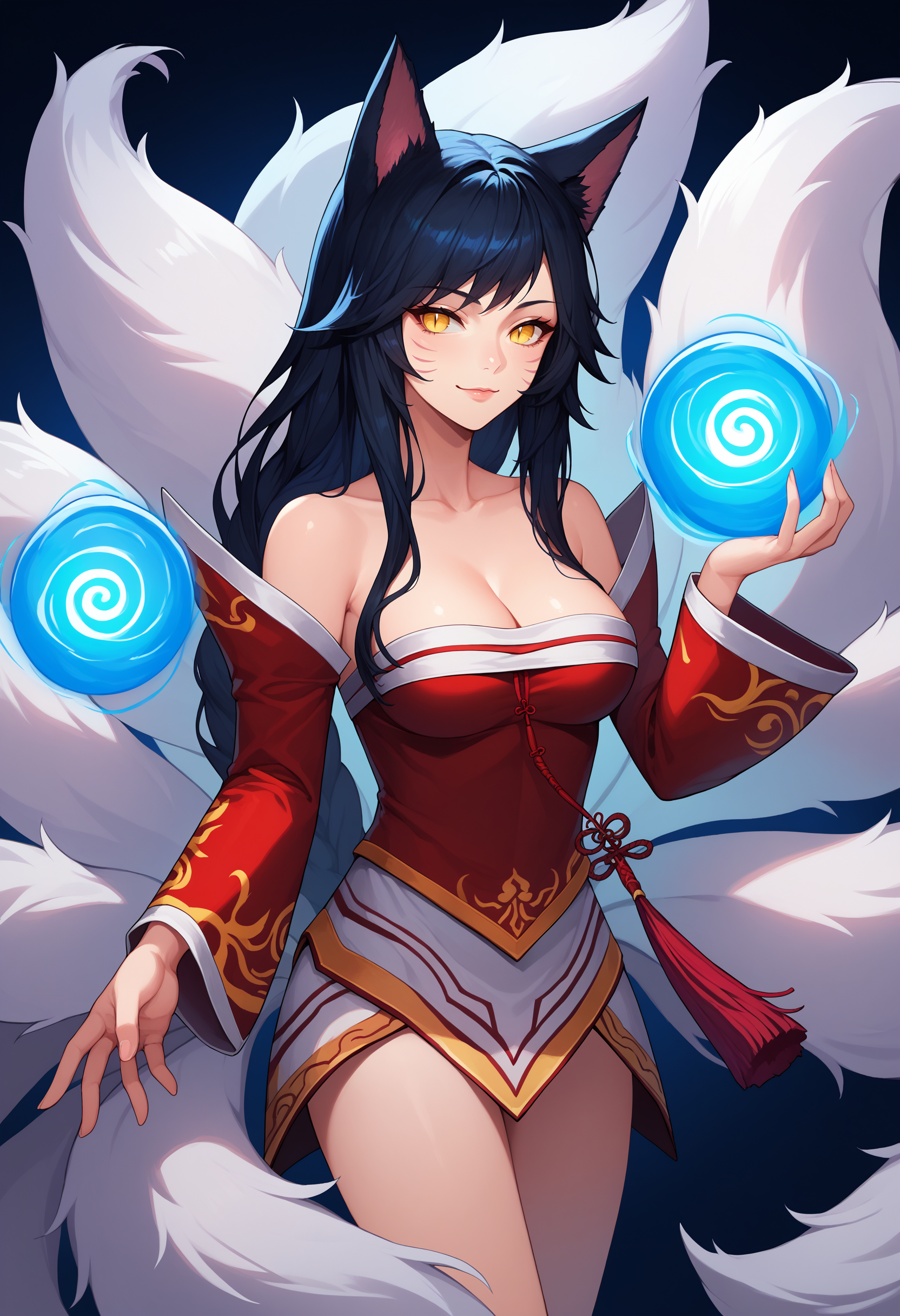 ahriImmortLgnd, animal ears, facial mark, fox tail, multiple tails, long hair, white hair, red eyes, large breasts, red lips, red nails, forehead mark, pendant, Dress, bare shoulders, detached sleeves, long sleeves, wide sleeves, cleavage, thighhighs