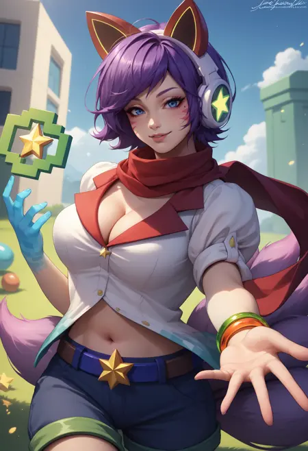 ahriarcade, animal ear headphones, fox tail, multiple tails, facial mark, mole under eye, short hair, purple hair, blue eyes, blue hand, large breasts, red scarf, short sleeves, striped clothes, shirt, cleavage, bracelet, jewelry, midriff, Navel, belt, Shorts, thighhighs, asymmetrical legwear, single thighhigh, star (symbol), purple boots