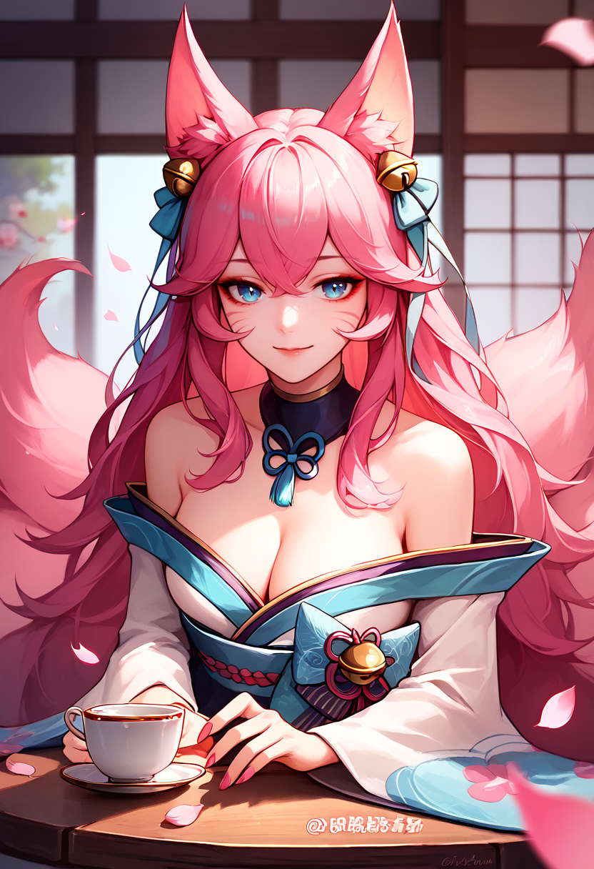 ahriSprtBlsm, animal ears, animal ear fluff, facial mark, fox tail, multiple tails, long hair, hair between eyes, pink hair, blue eyes, large breasts, hair ribbon, hair ornament, hair bell, japanese clothes, kimono, petals, bare shoulders, cleavage, bow, gradient thighhighs, pink nails