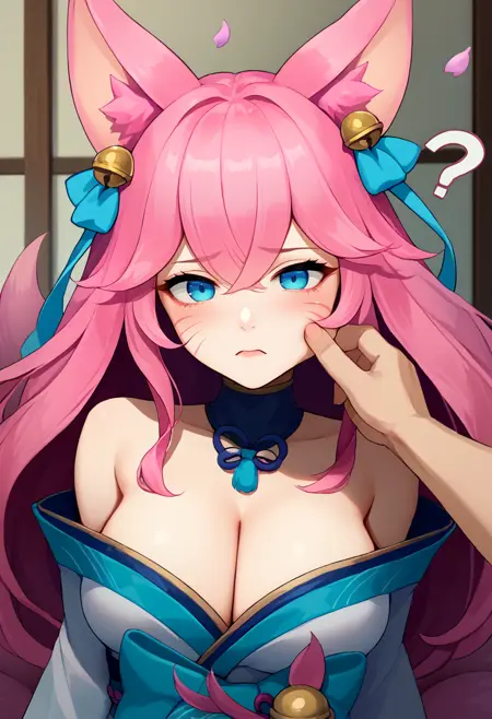 ahriSprtBlsm, animal ears, animal ear fluff, facial mark, fox tail, multiple tails, long hair, hair between eyes, pink hair, blue eyes, large breasts, hair ribbon, hair ornament, hair bell, japanese clothes, kimono, petals, bare shoulders, cleavage, bow, gradient thighhighs, pink nails
