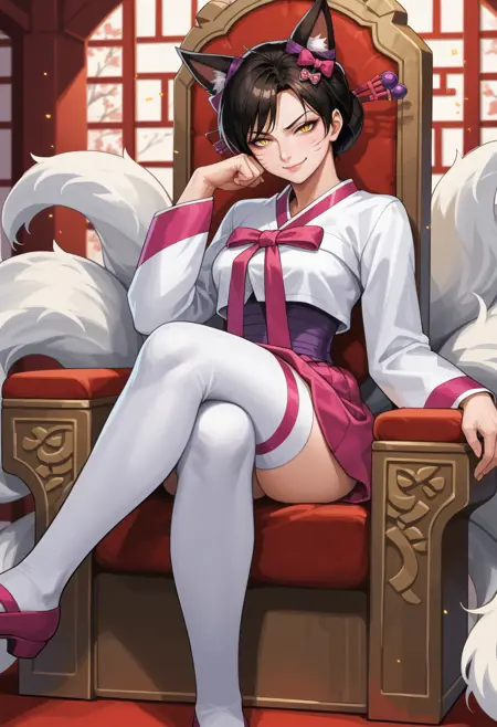 ahridynasty, animal ears, facial mark, fox tail, multiple tails, short hair, black hair, yellow eyes, breasts, hair Ornament, hair stick, korean clothes, hanbok, bow, ribbon, long sleeves, pink skirt