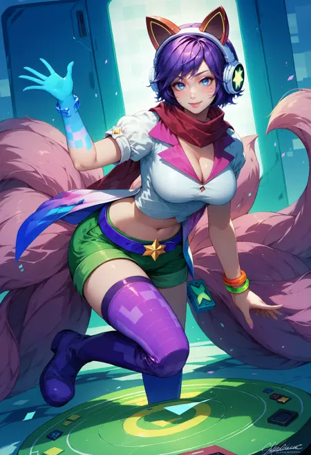 ahriarcade, animal ear headphones, fox tail, multiple tails, facial mark, mole under eye, short hair, purple hair, blue eyes, blue hand, large breasts, red scarf, short sleeves, striped clothes, shirt, cleavage, bracelet, jewelry, midriff, Navel, belt, Shorts, thighhighs, asymmetrical legwear, single thighhigh, star (symbol), purple boots