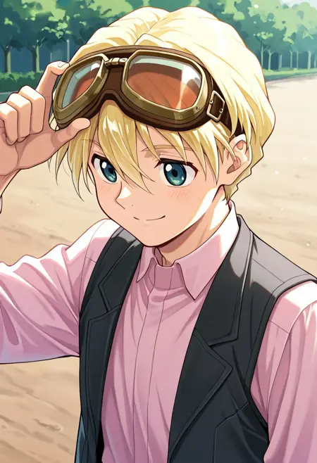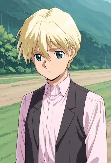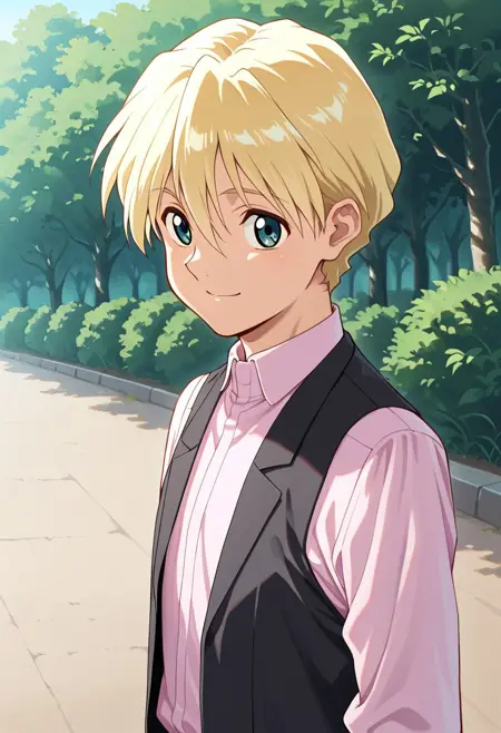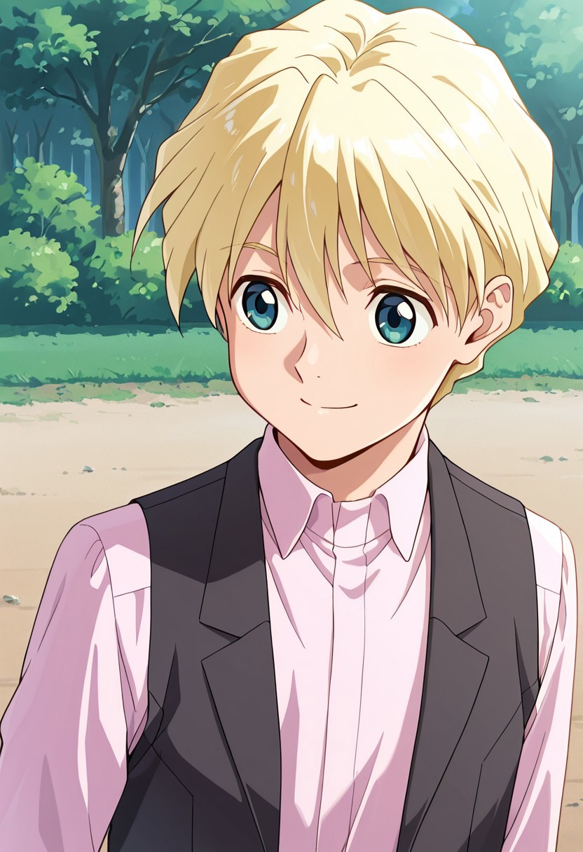 KatoruRababa, 1명의 남자아이, 남성 중심, 단독, 파란 눈, 금발, 분홍색 셔츠, 칼라 셔츠, 검은 조끼, 열린 조끼, 벨트, 갈색 바지, 신발,