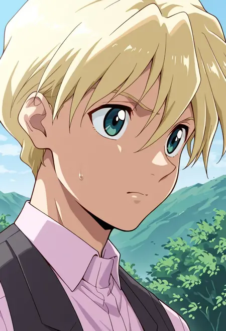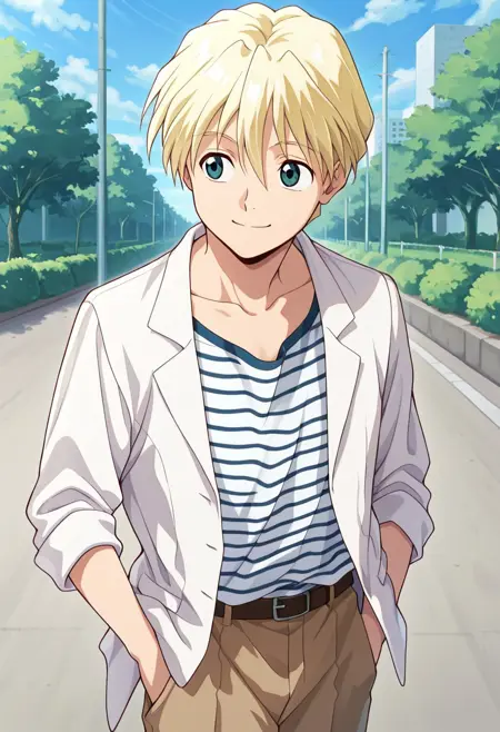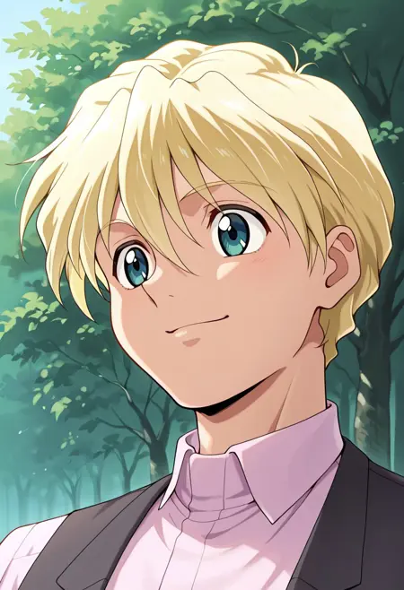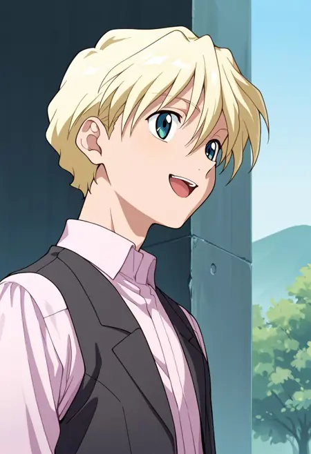raberba、金色の髪、1人の男性、男性に焦点、茶色のズボン、青い目、ズボン、シャツ、ベスト、紫のベスト、長袖、靴、ピンクのシャツ、茶色の靴、短い髪、ベルト、