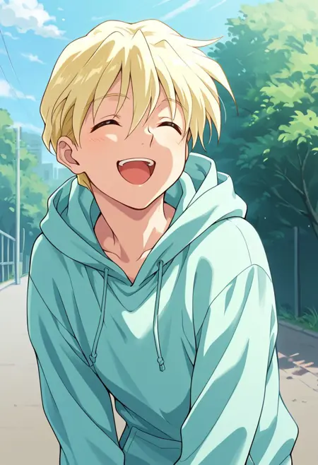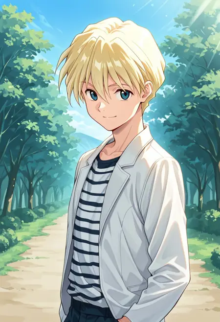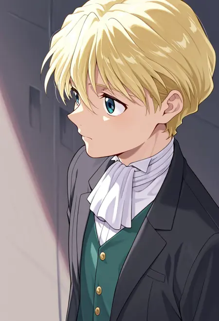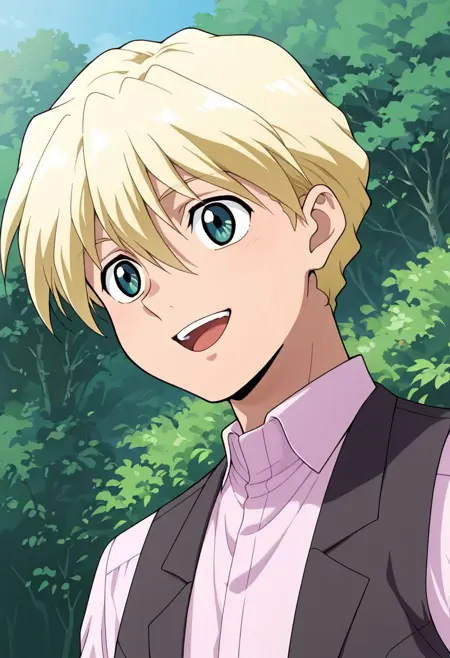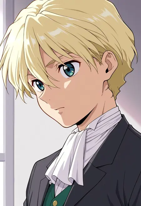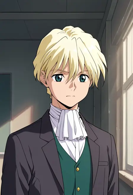 KatoruRababa, 1명의 남자아이, 남성 중심, 단독, 파란 눈, 금발, 학교 유니폼, 흰색 애스코트, 흰색 셔츠, 녹색 조끼, 검정 재킷,
