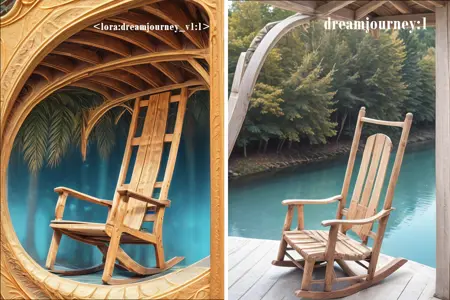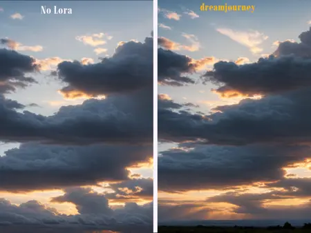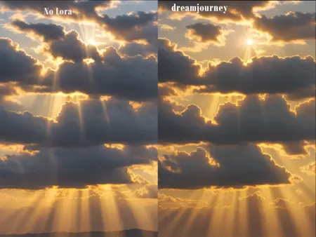 请注意:使用 dreamjourney:1 提示词主要用于微调图像,例如色彩增强或额外的色彩细节;而 lora:dreamjourney_v1:1 则用于生成类似 Midjourney “给我惊喜”(非提示词)风格的图像。