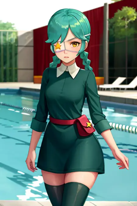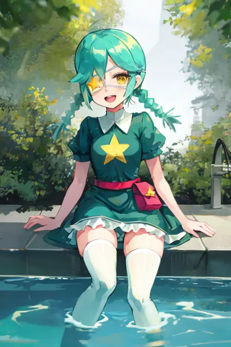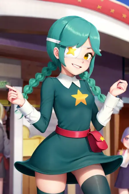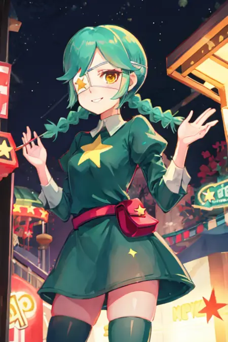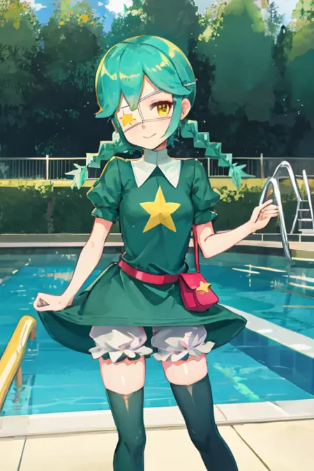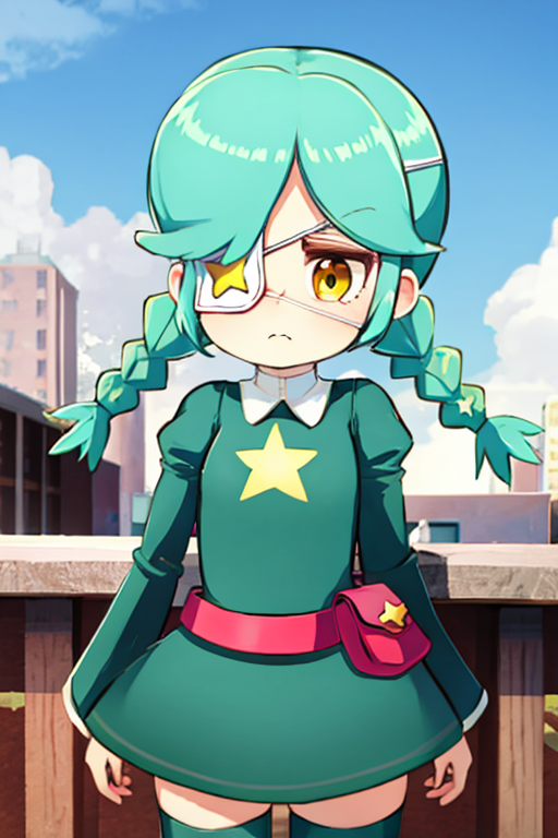 Use sgannie to summon her, use yellow eyes, star eyepatch, green hair, twin braids to form her face, use short dress, green dress, long sleeves, puffy sleeves, belt, pouch, belt pouch, star (symbol), white bloomers, thigh boots, green boots to give her default outfit, omit tag that out of composition