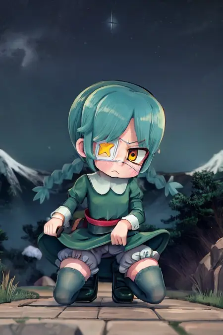 Use sgannie to summon her, use yellow eyes, green hair, short hair, parted bangs, twin braids, eyepatch to form her head, use green dress, star \(symbol\), belt pouch, green thighhighs, white bloomers, zettai ryouiki to summon her default attire, you can omit white bloomers, zettai ryouiki if you don't want her bloomers to appear.