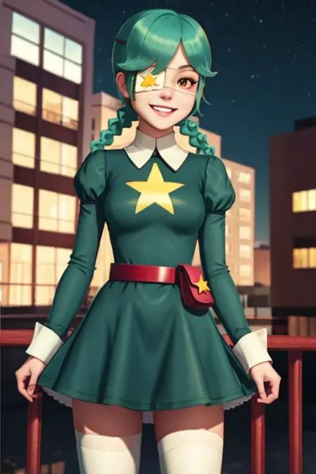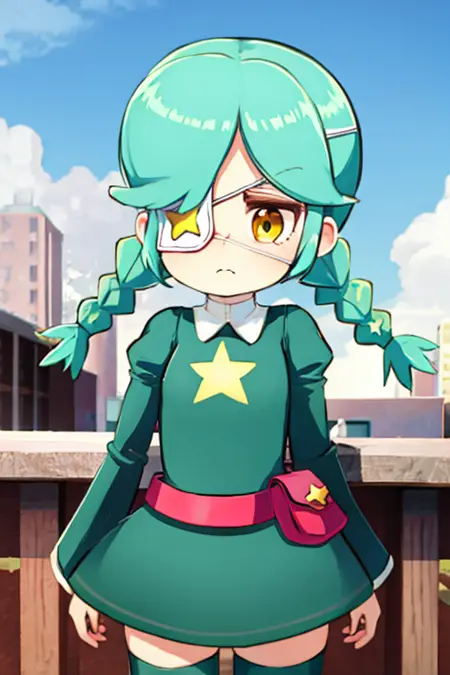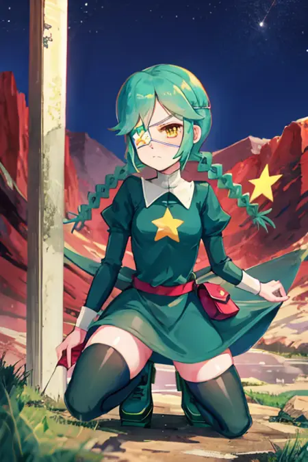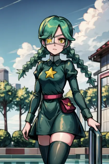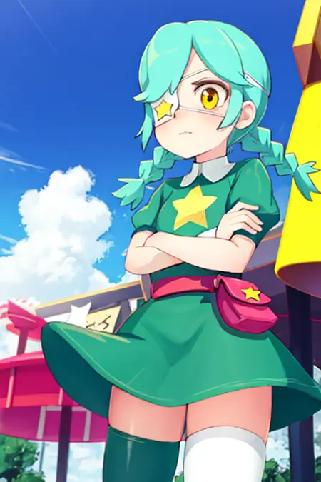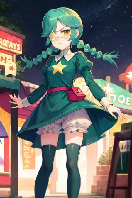 sgannie を使って召喚。顔は 黄色い目、星型アイパッチ、緑の髪、ツインテール を使用。DEFAULT服装は ショートドレス、緑のドレス、長袖、ふわふわの袖、ベルト、ポーチ、ベルトポーチ、星(シンボル)、白いブリーフ、太もも丈ブーツ、緑のブーツ を使用。構図外のタグは省略すること