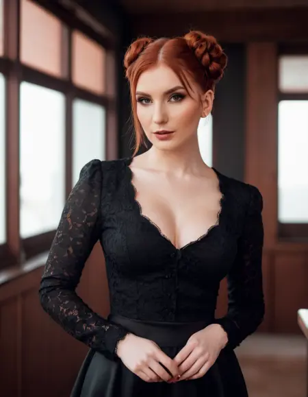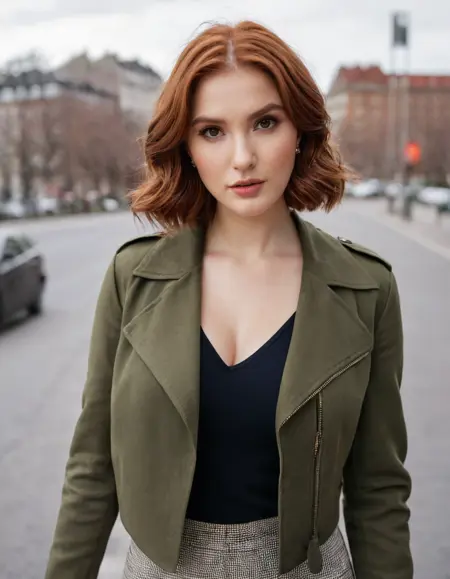 최고 품질, 걸작, 예쁜 여자, 22세, 하얀 피부, 동그란 얼굴, 예쁜 턱, 어깨 길이의 머리, 구리 빨간 머리, 파마 머리, 연한 갈색 눈, 아몬드 눈, 자연스러운 넓은 엉덩이, 넓은 다리, 가슴 B컵, 자연스러운 볼륨감 있는 허리와 골반의 누에형 몸매, 전신.