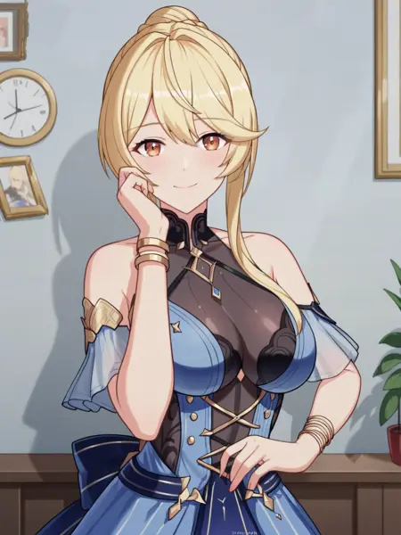 Hera_AG, Bluesky_Realm_Outfit, 1girl, blonde hair, braid, hair bun, large breasts, sideboob, jewelry, blue dress, bare shoulders, bracelet,