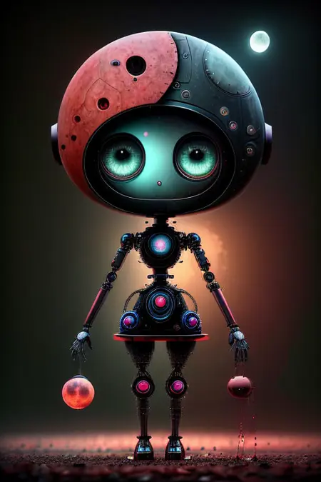 dark kawaii, drkkaw, robot, mecha, science fiction, no humans, glowing, realistic, non-humanoid robot, cable, solo, one-eyed, standing, radio, antenna, spikes, weapon, antennae, gears, size difference, steampunk, humanoid robot, horns, pink eyes, glowing eyes,