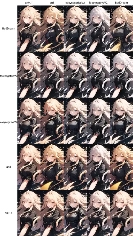 (An10、An9 是使用 kohya-ss 版本的文本反转(textual inversion)对 An8 重新训练,并将两种文本反转模式合并为嵌入:一种更接近 EasyNegative 效果,另一种更贴近模型原始图像风格。)