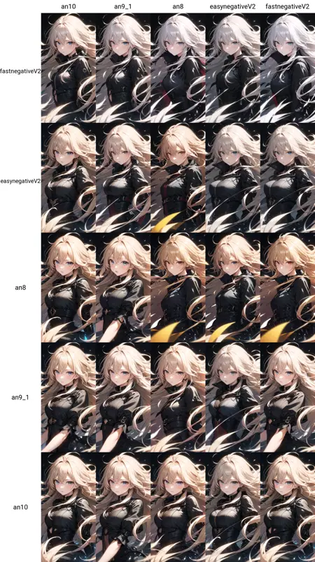 (An10、An9 是使用 kohya-ss 版本的文本反转(textual inversion)对 An8 重新训练,并将两种文本反转模式合并为嵌入:一种更接近 EasyNegative 效果,另一种更贴近模型原始图像风格。)