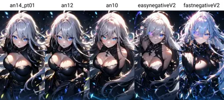(An10、An9 是使用 kohya-ss 版本的文本反转(textual inversion)对 An8 重新训练,并将两种文本反转模式合并为嵌入:一种更接近 EasyNegative 效果,另一种更贴近模型原始图像风格。)