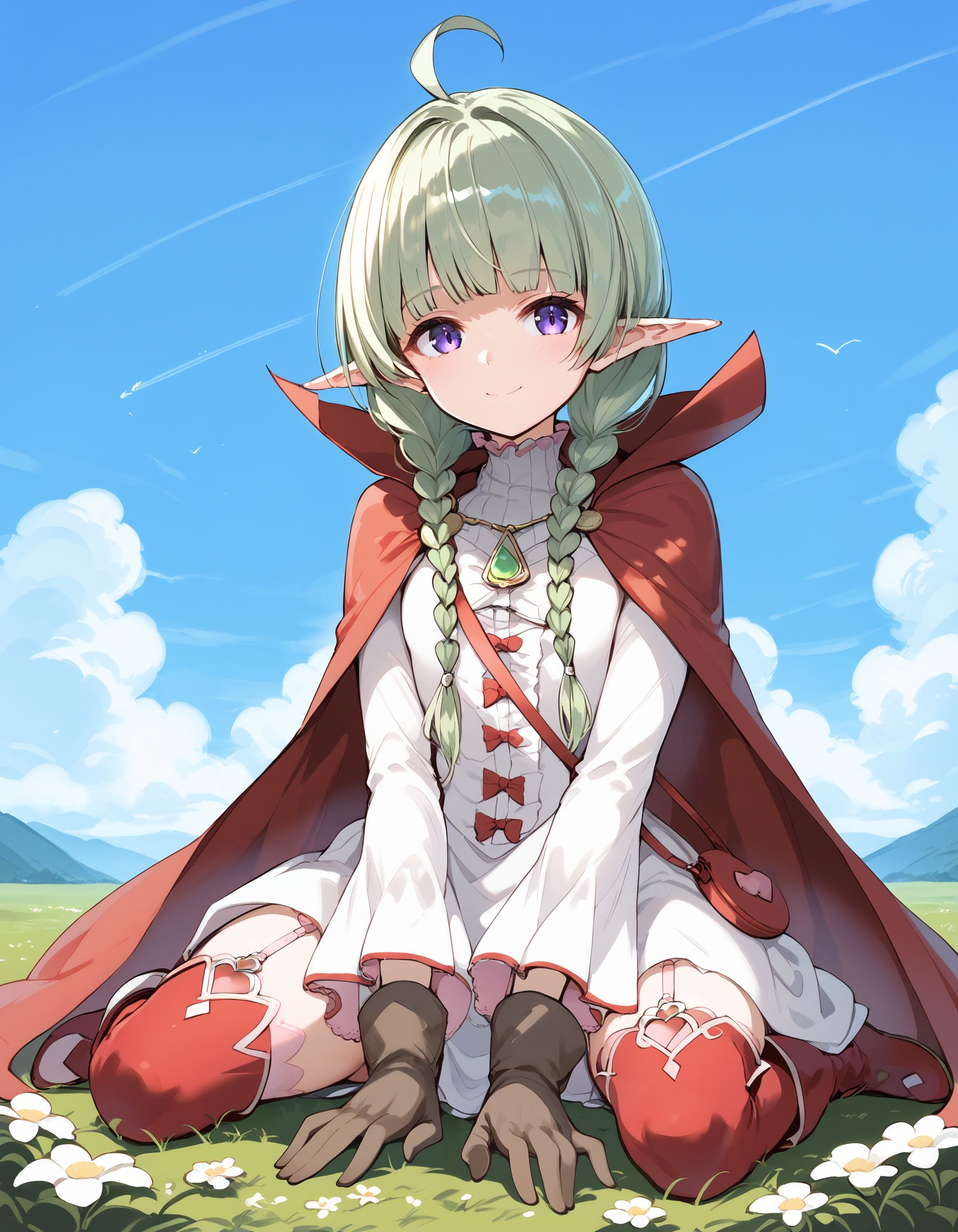 Add "green hair,cape,pendant,gloves,shoulder bag,dress,garter straps,thighhighs,thigh boots" for her typical look.