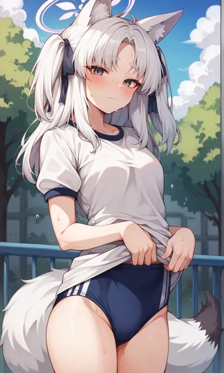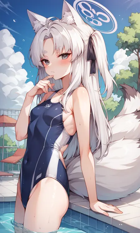 外見:くずの葉、灰色の目、太い眉毛、白い髪、分け目のある前髪、長い髪、両サイドアップ、黒い髪リボン、狐の耳、狐の尾、複数の尾、光輪