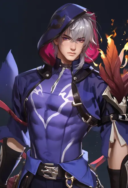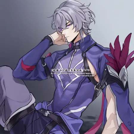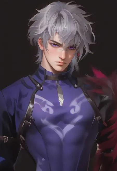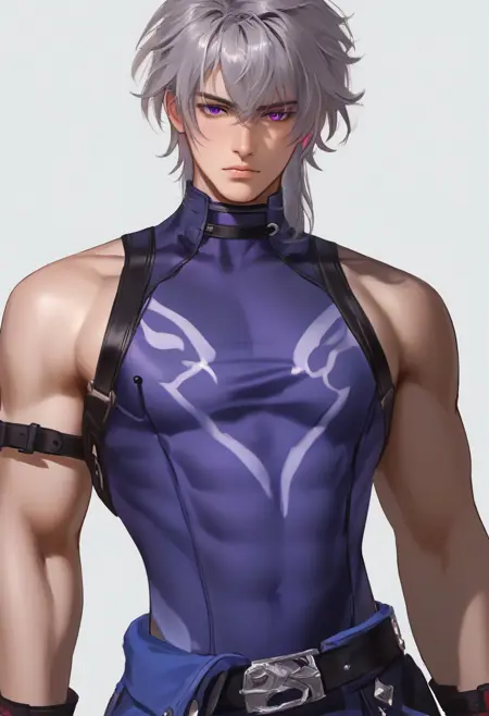 1boy, solo, male focus, slim toned male, moze_(hsr), moze, 灰紫色头发, 狼切发型, 眉间刘海, 苍白皮肤, 紫色眼睛, 瘦长脸型,