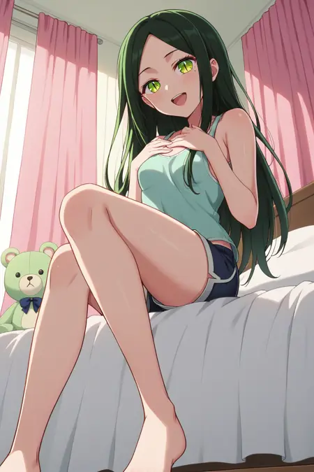 트리거: KJOfrill, 녹색 머리카락, 녹색 눈, 세로로 긴 동공, 눈 밑 점, 눈 밑 점, 긴 머리카락, 갈라진 앞머리
