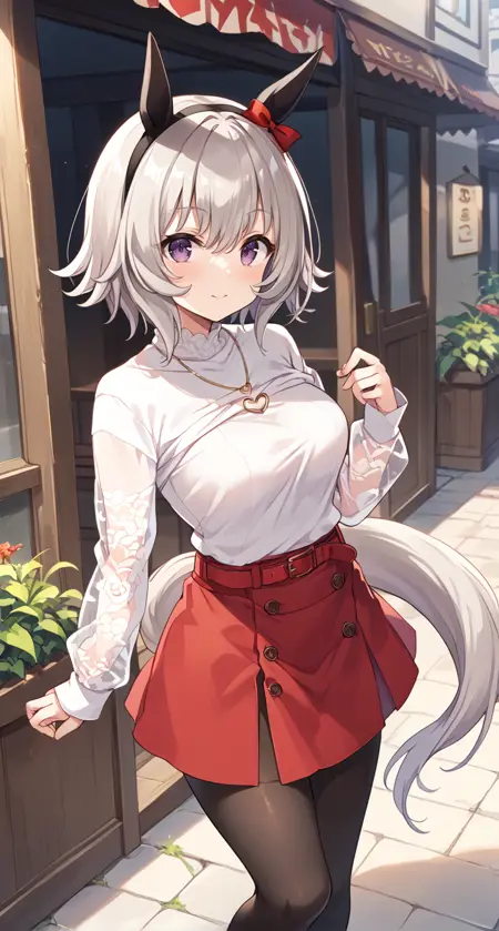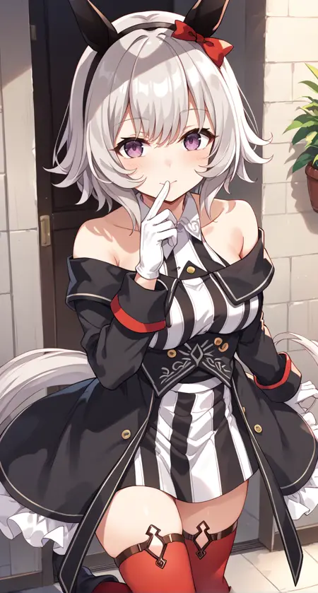 fishnet pantyhose, fishnets, grey hair, hair between eyes, horse ears, horse girl,