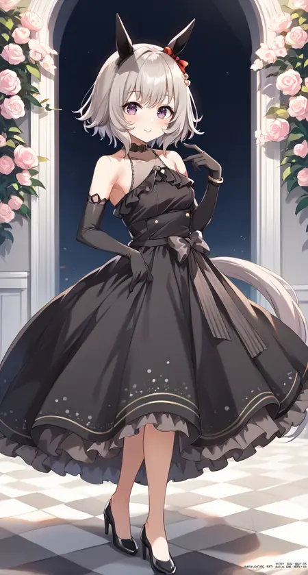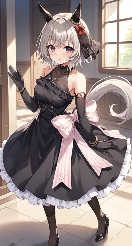 horse ears, horse tail, ribbon, short hair, tail, wedding dress, black dress, black gloves,