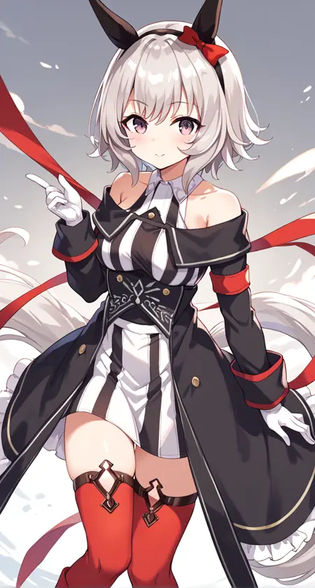 thigh-highs, ear ribbon, red ribbon, ribbon, white hair, black hairband,