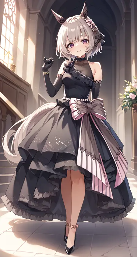 horse ears, horse tail, ribbon, short hair, tail, wedding dress, black dress, black gloves,