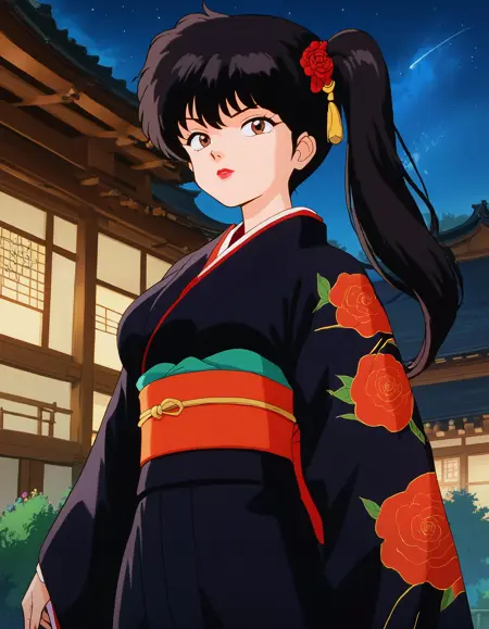 Character: 1girl, Kodachi, 1990s style, black hair, side ponytail, bangs, fluffy hair, brown eyes, lipstick, red ribbon, big breast,