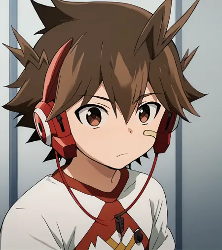 TodorokiKakeruPerson,brown hair,brown eyes,spiked hair,headphones,hair between eyes,ahoge,bandaid on face,