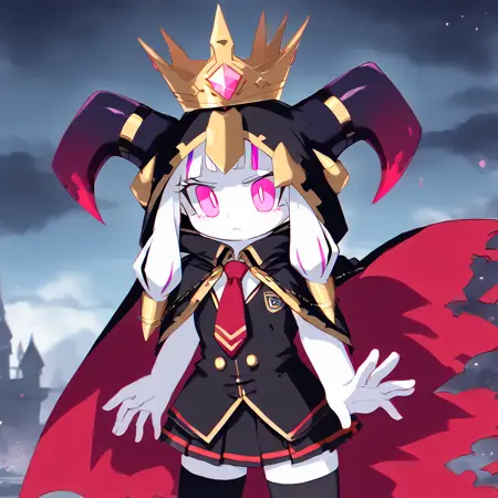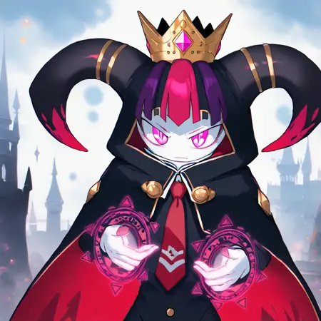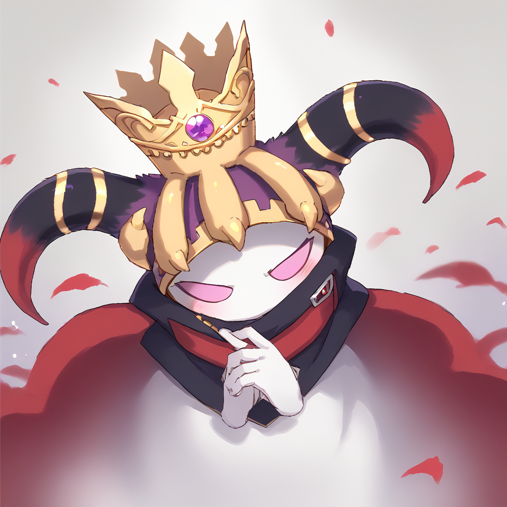태그: 1남자, 혼자, 인간 없음, 보라색 눈, 흰색 피부, 색상이 있는 피부, 망토, 뿔, 왕관, 후드