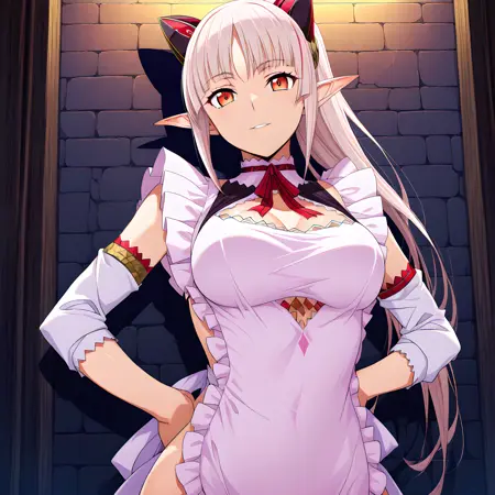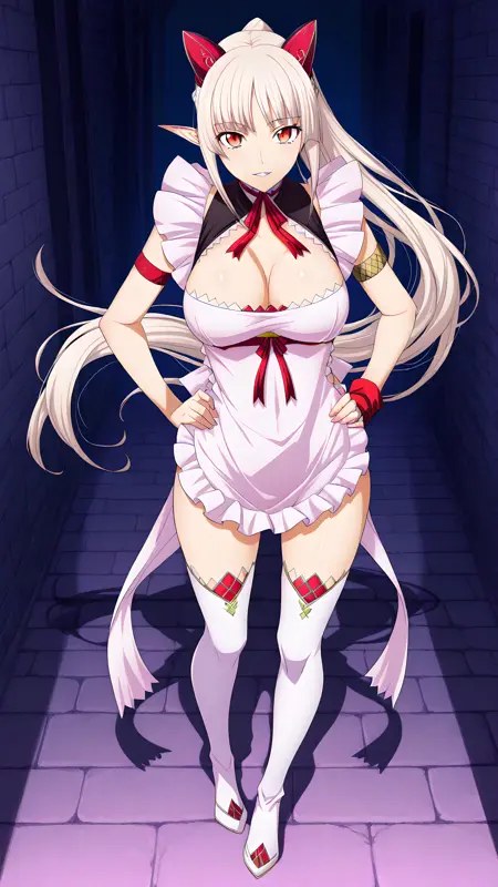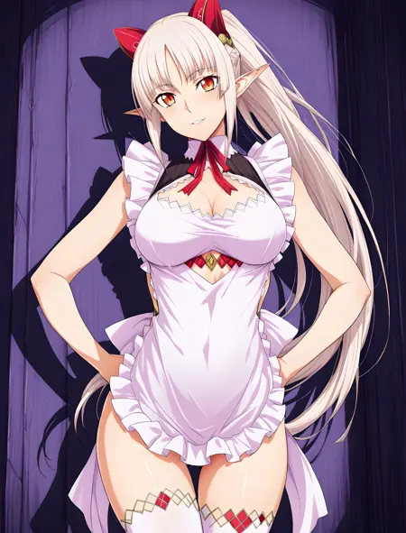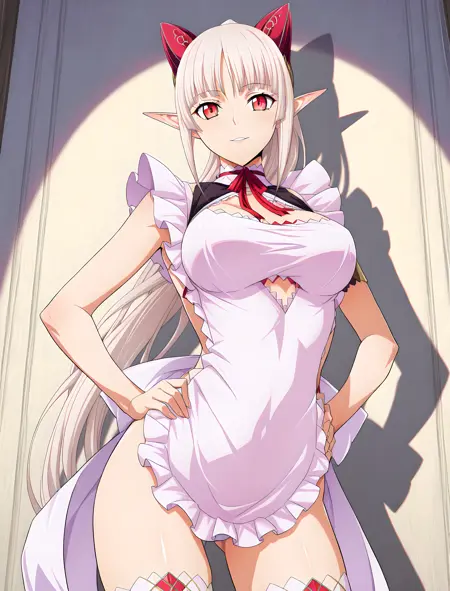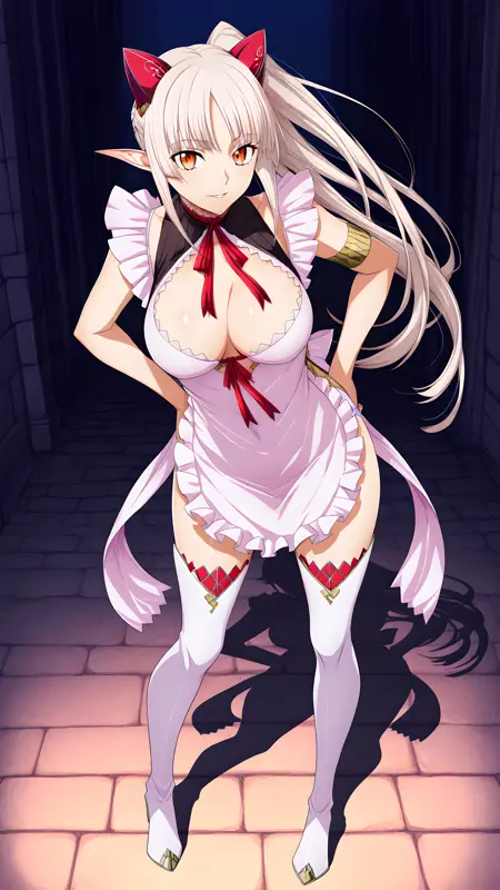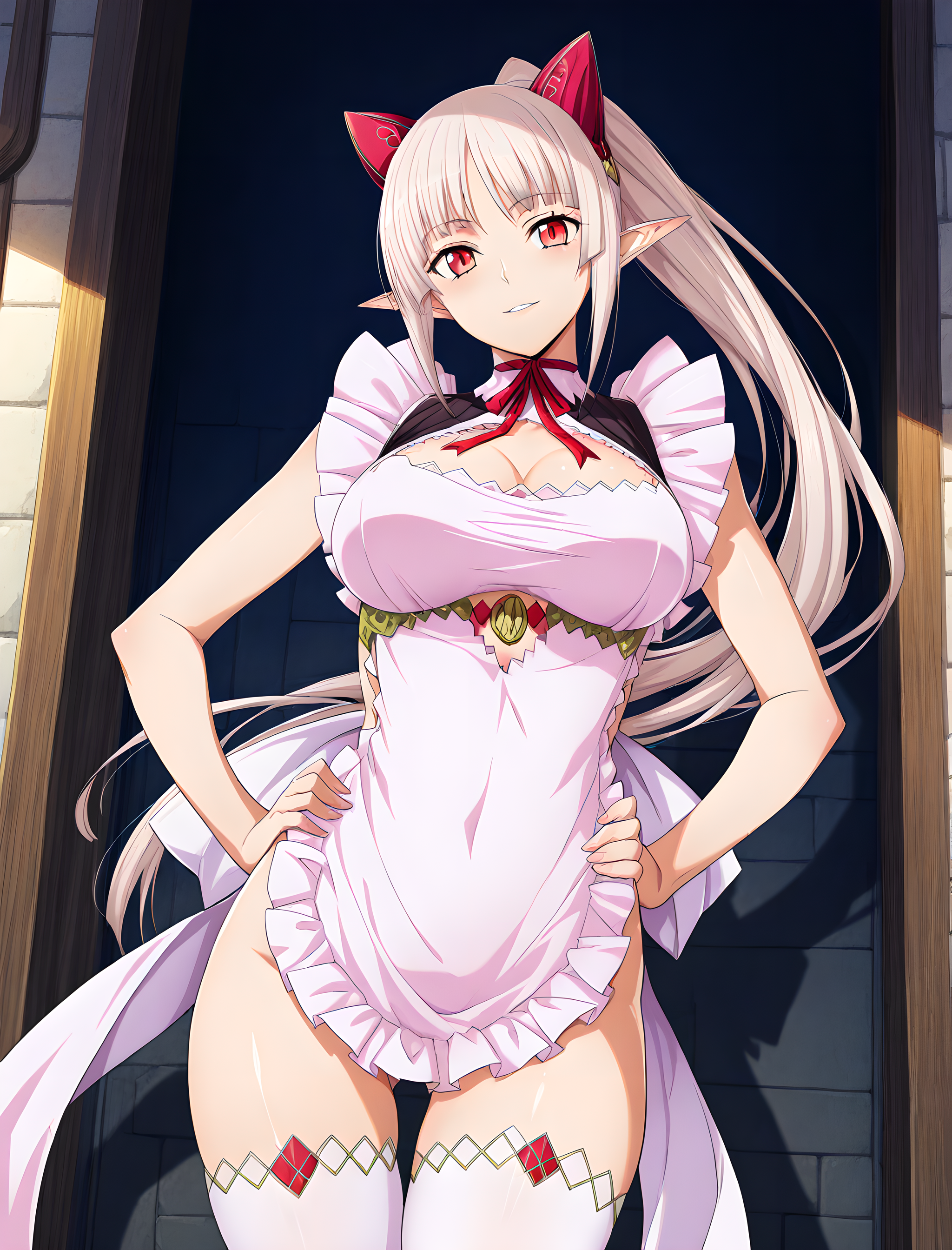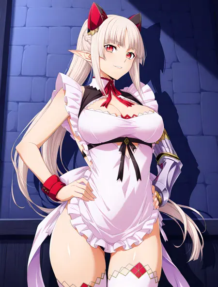 アクティベーションタグは "aldra(qbr)," です。外見は "尖った耳、胸、太ももハイ、太ももブーツ、パンティ、大きな胸、下着、赤い目、エプロン、長い髪、サイドタイパンティ、白髪、ポニーテール" です。