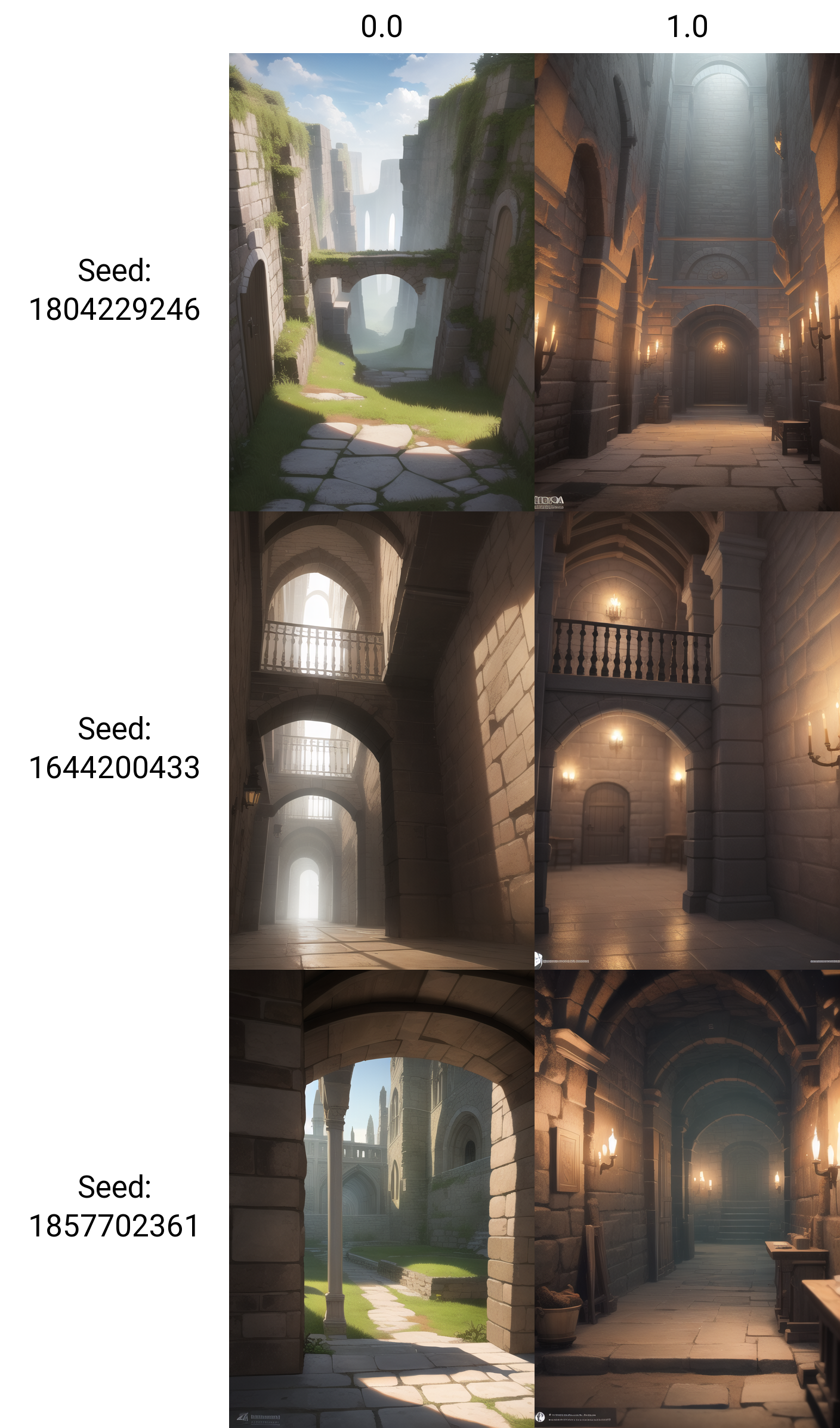 이 LoRA는 던전 배경 생성을 위한 간단한 모델입니다. 일부 베이스 모델은 이를 수행할 수 있지만, 일관성 없이 작동하며 제가 원했던 지하/어두운 분위기로는 제대로 생성하지 못합니다. 베이스 모델과의 비교를 위해 예시 이미지를 참고하세요.