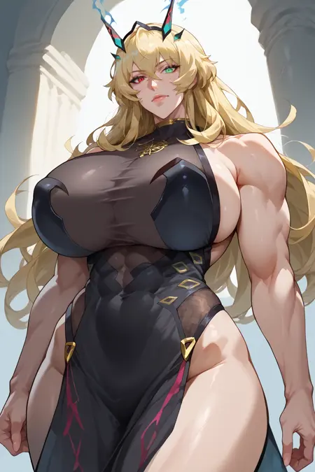 トリガー: barghestrd, 筋肉質の女性、金髪、長髪、角、緑の目、赤い目、虹彩異色症、大/巨大な胸(お好みで)