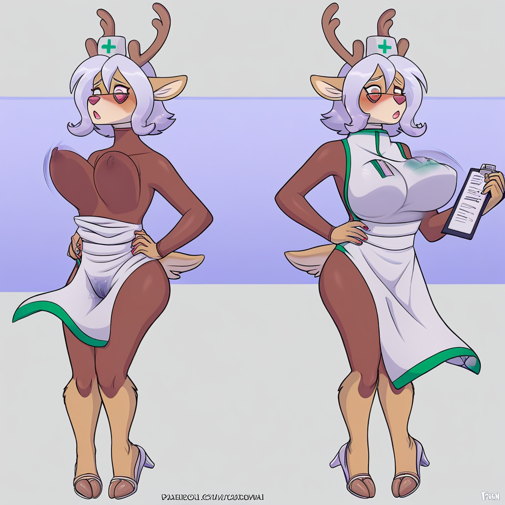nursekadath, ,deer, anthro deer, silver hair, grey eyes,big breasts, big ass,