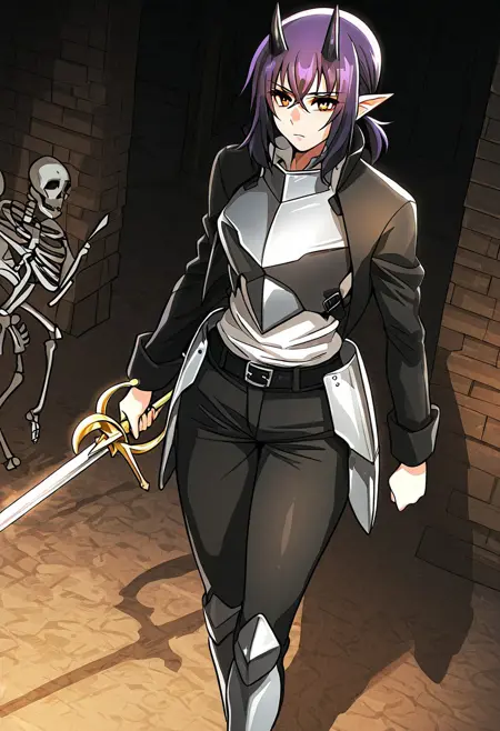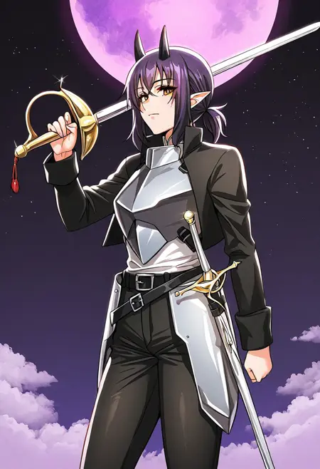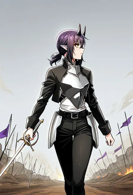 1. ((轻甲,敞开的黑色夹克,金属胸甲,白衬衫,黑裤子,黑色腰带,金属髋甲,金属胫甲,黑色剑带,黑色剑鞘,)) 金十字护手细剑;白色剑鞘,简约白色握柄短剑