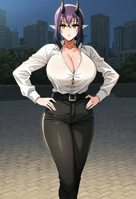 2. ((性感长袖白衬衫,露骨乳沟,巨大乳沟,黑裤子,黑色腰带,))