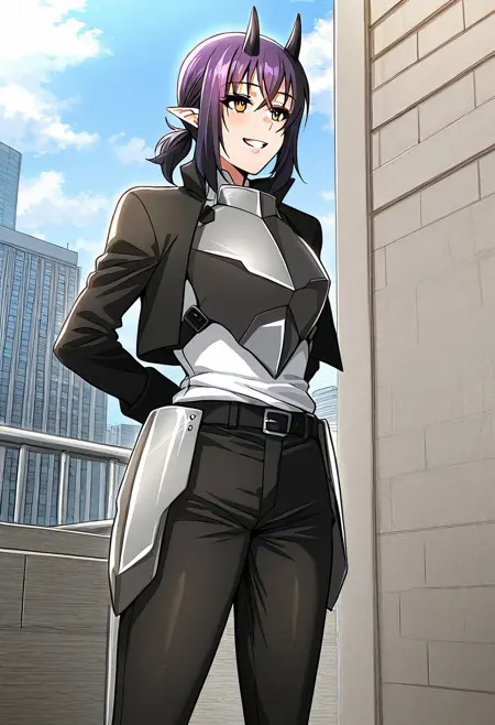(( lora:ozma_zoroaster:1 , ozma_zoroaster, 纤细腰身,宽臀,美丽肌肤,锐利琥珀色双眼,清澈瞳孔,明亮眼珠,美丽双眼,美丽紫色长发,低马尾,发丝垂于眼前,刘海,丰满蓬松的巨乳,自然美,超凡美丽女性,迷人女性,超级性感女性,欲望之躯,拥有诱惑露骨身材的性感女性,性感体态,丰腴身材,性感美人,无穿孔,无刺青,尖耳,)), ((锋利的黑色恶魔角,))