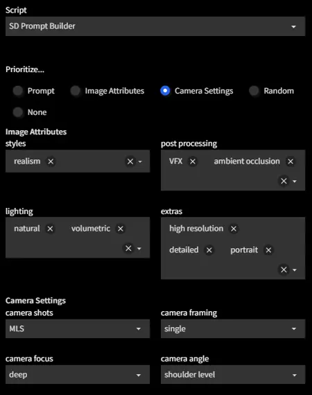 You can choose what matters most! Employ the radio buttons to switch between Prompt, Image Attribute, Camera Settings, and Random priorities to more accurately represent the type of image you're after.