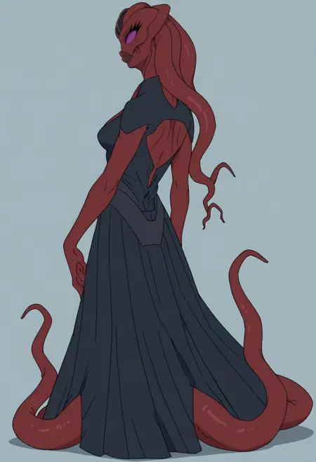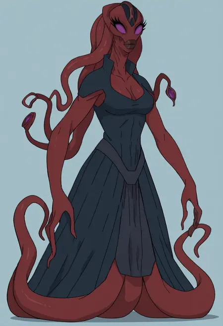 1girl, 色付きの肌, 赤い肌, 紫色の目, 瞳なし, 睫毛, 唇, 厚い唇, モンスターガール, 外星人, 触手, 触手状の髪