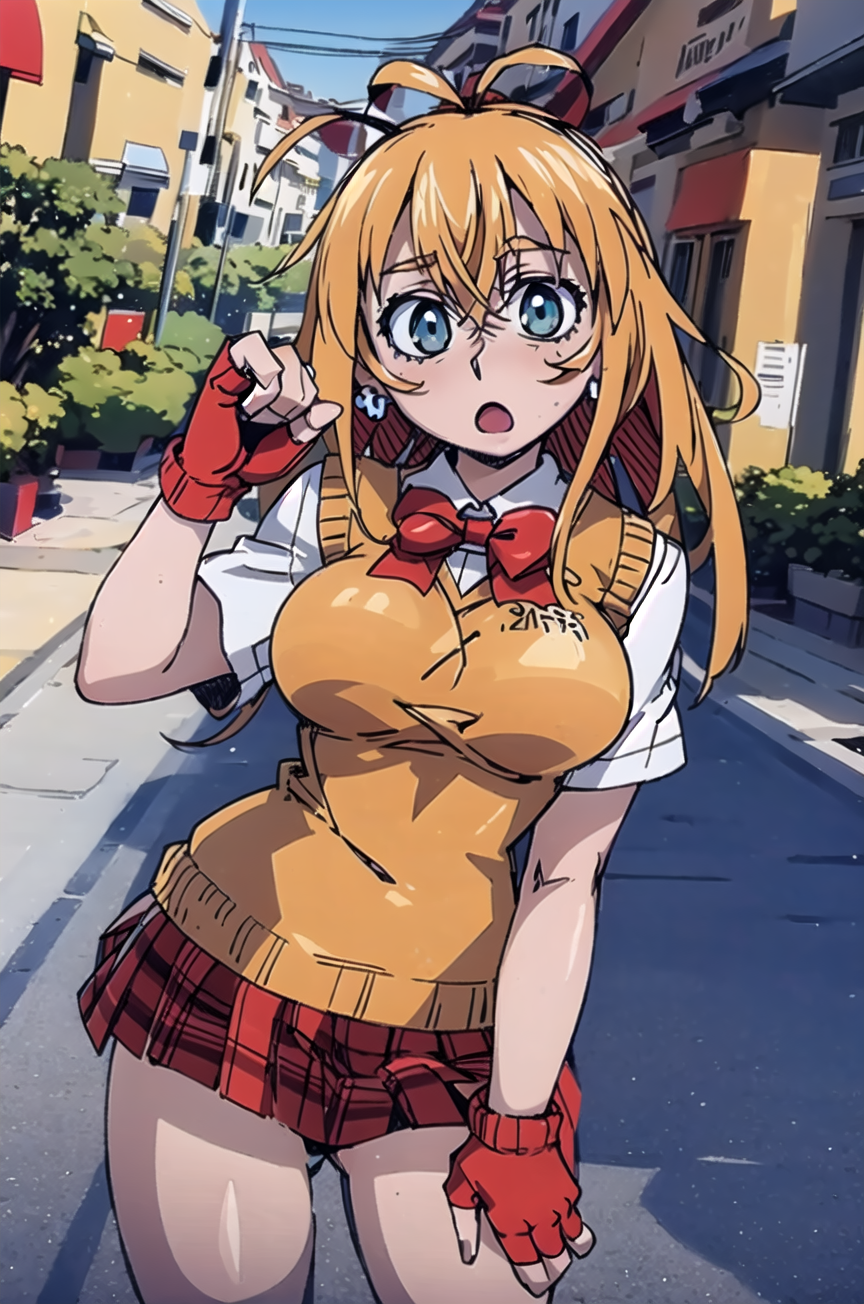 服装はひとつだけ。プロンプトは:** sonsaku hakufu, earrings, red bow, sweater vest, white shirt, plaid skirt, white socks, loafers **