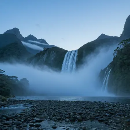 professional DSLR photo of a misty lagoon, dawn, mountains and waterfall in the background, rising sun beyond the mountains, masterpiece