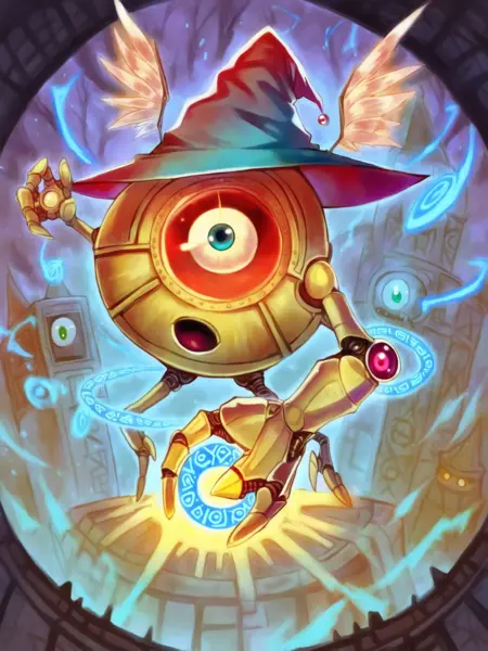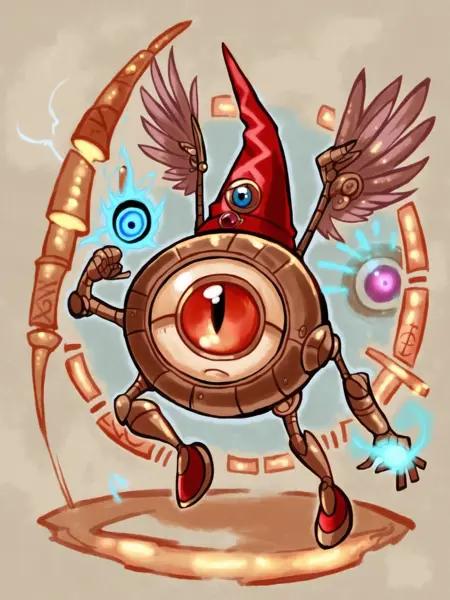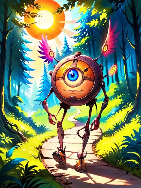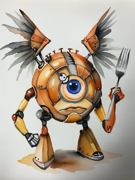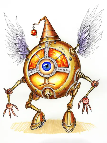 원형 몸체, 한 눈, 두 팔, 두 다리, 그리고 기본적인 날개가 있음. 이를 생성하려면 "circular shape, one eyed, cyclops, wings"를 추가하세요.