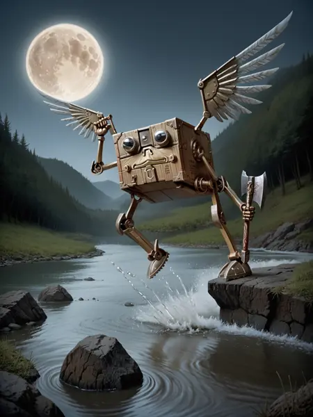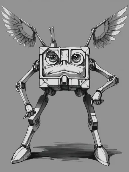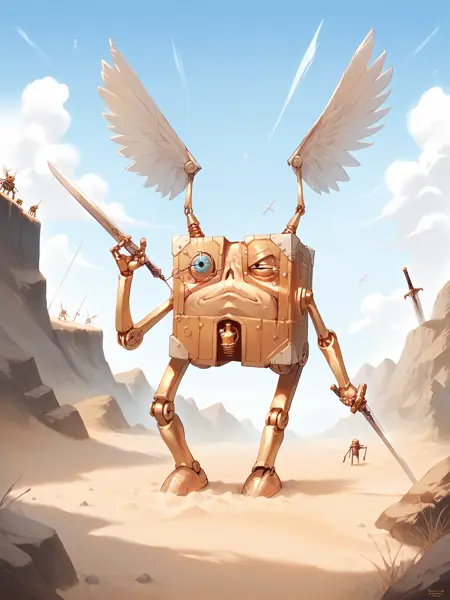 体は立方体で、短い簡素な翼、2本の腕、2本の脚を持っています。これを生成するには「cubic shape, wings」を追加してください。