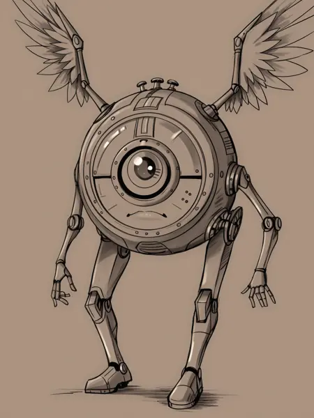 体は球形で、1つの目、2本の腕、2本の脚、簡素な翼が付いています。これを生成するには「circular shape, one eyed, cyclops, wings」を追加してください。