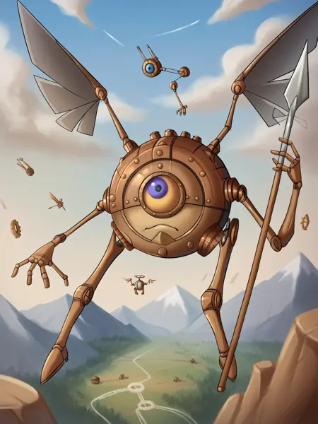 体は3面のピラミッド形で、各面に1つの目があり、3本の腕と6本の脚を持っています。これを生成するには「pyramid shape, 3 arms, 6 legs」を追加してください。この組み合わせはXLバージョンでは効果がありませんが、ポニー版ではたまに使える結果が生成されます。
